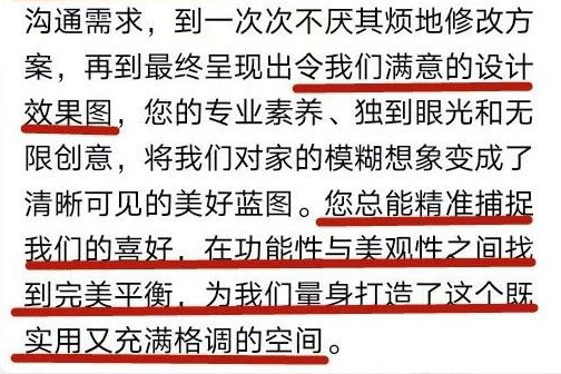 這次找紅牛裝飾公司裝修,也是朋友介紹的。各方面安排比較及時到位,質量控制上也比較好,總體感覺滿意。設計師顧娟工作負責,業(yè)務能力、協(xié)調能力都較強,為這次裝修的滿意完工奠定了基礎!項目經(jīng)理錢新平統(tǒng)籌能力較強,工作負責,安排的水電工、瓦工、木工和油漆工都比較認真負責,手藝也不錯,保證了裝修的施工質量。工程監(jiān)理宋昕業(yè)務精湛,工作認真負責,對裝修施工考慮全面,對質量要求嚴格,經(jīng)常深入工地巡查,發(fā)現(xiàn)問題及時指出,很好地為施工質量把了關。這次找紅牛裝飾公司裝修的體驗是愉快的,謝謝各位!